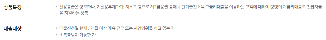 신용등급은 양호하나 신용부채가 과다한 경우, 저소득으로 2금융권 고금리 대출을 이용하고 있는 분에게 저금리 대출로 긴급자금을 지원하는 대출 상품이 있습니다.