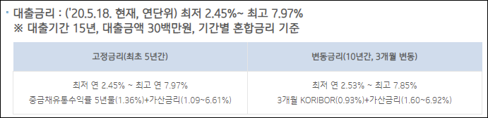 연간 2.45%에서 7.97%의 금리가 적용될 수 있지만 신청시기 및 대출조건 등에 따라 실제 금리는 달라질 수 있으니 참고만 하시길 바랍니다.