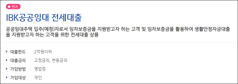 기업은행 공공임대 전세대출 조건안내