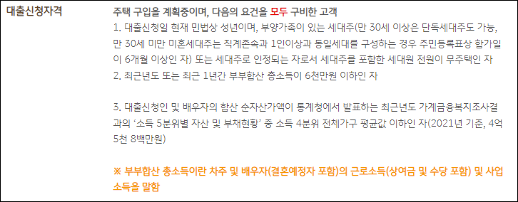 - 대출신청인 및 배우자의 합산 소득이 4억 5천 8백만원 이하인 분(2021년도 기준)
