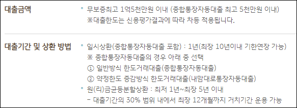 - 만기일시상환 : 최초 1년, 만기전 연장신청을 통해 최장 10년까지 이용가능