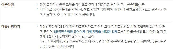 국민은행 개인신용평가 시스템에 의해 대출적격자로 판정된 분 중 대출 신청일 현재 동일 직장에 1년이상 연속하여 재직중이며, 국민은행과 급여이체 대행계약을 체결한 사업체에 재직하고 있는 분이 신청할 수 있습니다.