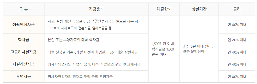 대출금리는 학자금의 경우 연 2.0%, 나머지 자금용도의 경우 연 4.0%로 신용회복 지원을 받고 계시는 분이 받을 수 있는 대출상품중 가장 낮은 금리가 적용됩니다.