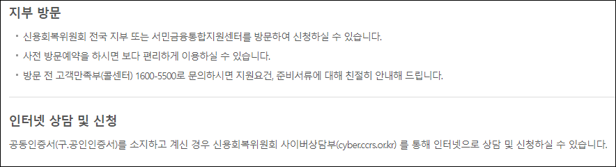 신용회복위원회 지부 방문이 어렵거나 꺼려지는 경우 신용회복위원회 사이버 지부에서 인터넷으로 신청할 수 있습니다.