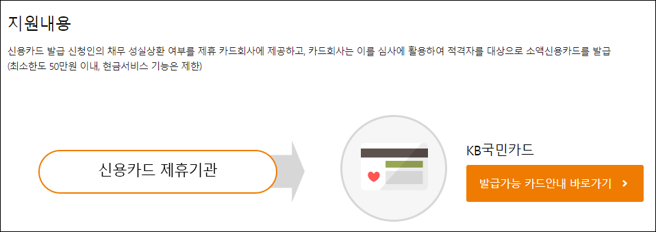 신용회복위원회에서는 신용카드 발급 신청인의 채무 성실상환 여부를 제휴 카드사인 국민카드에 제공하고 국민카드는 이를 심사에 활용하여 적격자를 대상으로 소액 신용카드를 발급합니다.