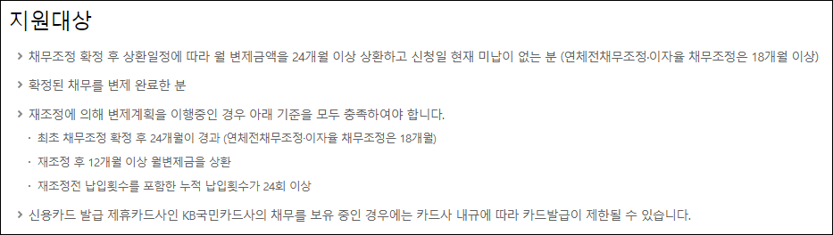 신용회복위원회 채무조정 확정 후 상환일정에 따라 월 변제금액을 24개월 이상 상환하고 신청일 현재 미납이 없는 분 및 확정된 채무를 변제 완료된 분이 지원대상이 됩니다.