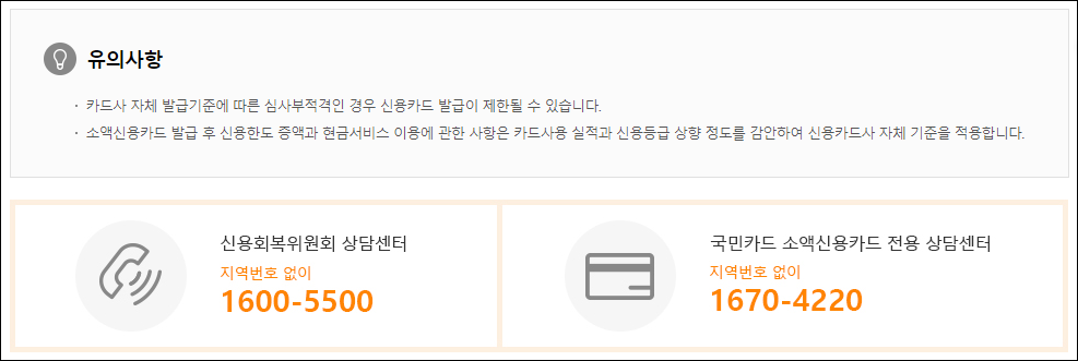 보다 자세한 안내는 신용회복위원회 상담센터 1600-5500 또는 국민카드 소액신용카드 전용상담센터 1670-4220으로 연락하여 문의하시면 좋겠습니다.