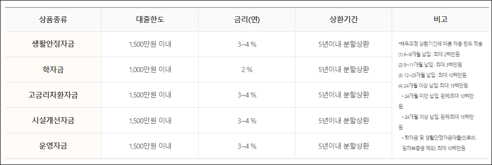 대출기간은 5년 이내 분할상환의 방식으로 대출금 상환이 진행되며, 연 2~4%의 금리가 적용되니 이용에 참고하시길 바랍니다.