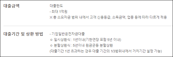 대출한도는 최대한도 내에서 신청인의 신용등급 및 소득금액, 사업영위 업종 등에 따라 달라질 수 있습니다.