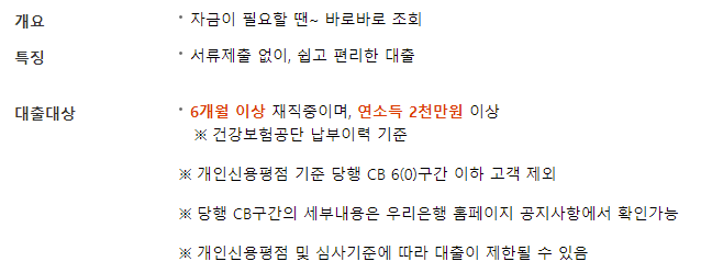 다만 개인신용평점 기준 우리은행 CB 6 구간 이하인 분은 제외되며, 개인신용평점 및 심사기준에 따라 대출이 제한될 수 있습니다.