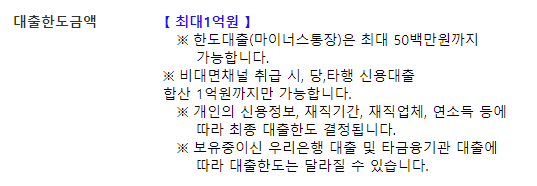 우리은행 비대면 대출의 한도는 최대 1억원까지 책정될 수 있으며, 마이너스통장대출은 최대 5000만원까지 한도가 책정됩니다.