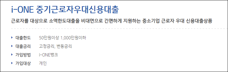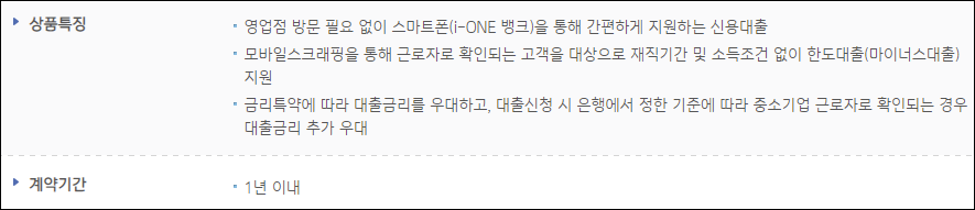 근로자를 대상으로 소액한도 대출을 비대면으로 간편하게 지원하는 근로자 우대 비대면 대출 상품이 있습니다.