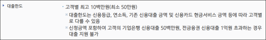 대출한도는 신청인의 신용등급 및 상환여력에 따라 개인별로 달라질 수 있으니 유의바랍니다.