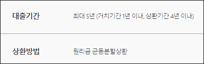 대출기간은 최대 5년으로 약정되며, 이 중 1년은 이자만 납입하는 거치기간으로 활용되고 나머지 4년간 원금과 이자를 분할하여 상환하는 방식을 대출금 상환이 진행됩니다.