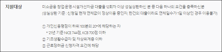 - 개인신용평점이 하위 100분의 20에 해당하는 분 (21년 기준 NICE 744점, KCB 700점 이하)