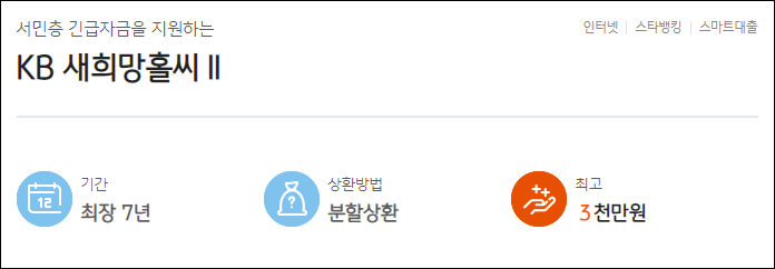 국민은행 새희망홀씨는 저소득/저신용 계층의 생활안정을 지원하기 위해 만들어진 정부지원 서민대출 상품입니다.
