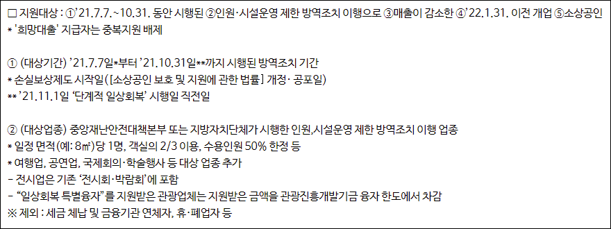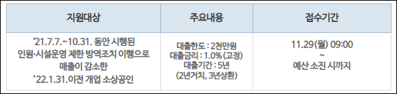 - 2021년 7월 7일부터 10월 31일까지 시행된 인원/시설운영 제한 방역조치 이행으로 매출이 감소한 22년 1월 31일 이전 개업 소상공인