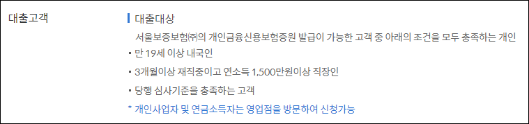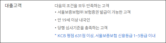 - KCB 평점 631점 이상, 서울보증보험 신용등급 1~5등급 이내