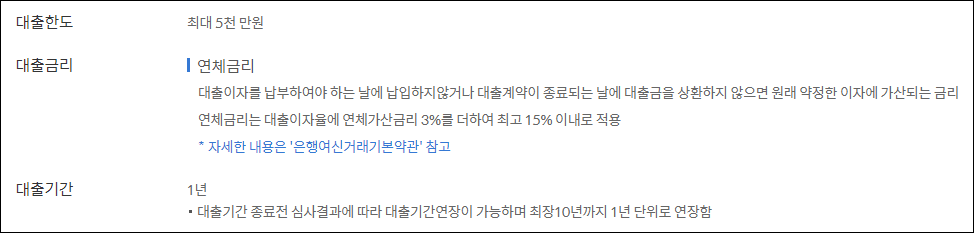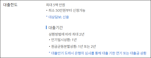 - 대출기간 : 1년 (1년단위로 연장하여 최장 10년까지 이용가능)