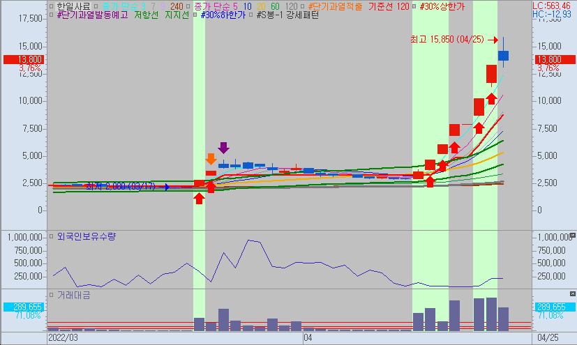 만약 한일사료 종목에 오늘(2022년 4월 25일) 매수진입하였다면 적당한 수익률 또는 적당한 손실로 매매를 마감하는 것이 좋습니다.