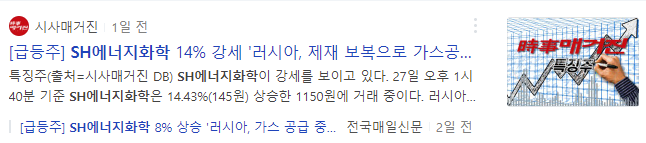 러시아의 전쟁이 종료되더라도 한동안 가스공급 대란이 발생할 우려가 있고 따라서 SH에너지화학의 주가는 추가상승할 가능성이 있다고 판단되니 투자에 참고하시길 바랍니다.