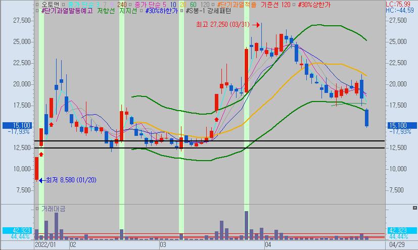 이미 손쓸수 없을만큼 하락이 손실률이 큰 분은 오토앤이 바닥을 잡은 후 반등이 어디까지 나오는지 확인하면서 대응하시길 바랍니다.