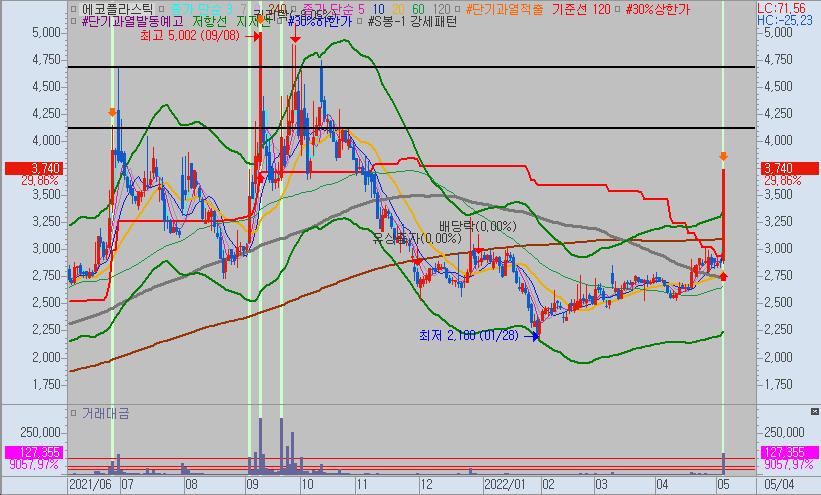 다만 고점가격인 5000원대를 돌파할 수 있을지는 미지수이니 에코플라스틱을 보유하고 계신 분은 최소익절가를 설정하고 5000원을 돌파하는지 확인해보는 것도 좋겠습니다.