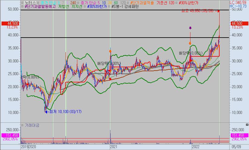 역대 최대 규모의 무상증자 결정으로 노터스는 52주 신고가를 경신하였습니다.