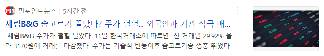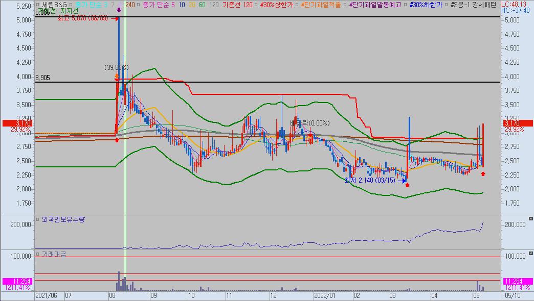 세림B&G에 신규진입을 원하시는 분은 오늘 장초반부터 따라붙지 마시고 눌림조정이 나오면 저점을 확인하고 매수하는 것이 리스크 관리에 유리할 것으로 예상됩니다.