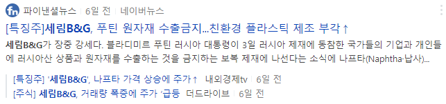 5월 4일 플라스틱 대장주들이 먼저 상승했고 10일에는 플라스틱 원료 나프타 가격 급등에 따른 수혜 기대감으로 세림B&G가 상한가를 기록하였습니다.