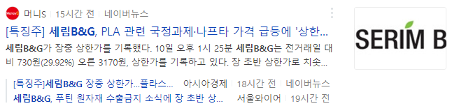 세림B&G는 플라스틱의 원료인 '나프타' 가격이 급등세를 지속하고 있다는 소식으로 수혜 기대감이 부각되며 10일 상한가를 기록했습니다.