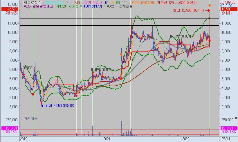 태웅로직스는 지난번 코로나19로 인해 물류테마가 급등했을 당시 상장 최고가를 돌파하였습니다.