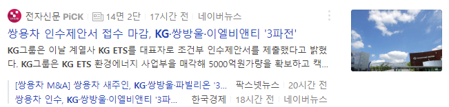 어제 쌍용차 인수제안서 접수가 마감되었다는 소식으로 오늘 KG 그룹 관련주가 강세를 보이고 있습니다.