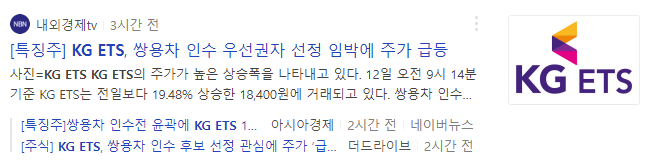 [머니픽뉴스/백정은 기자] 12일 KG ETS가 강세를 보이고 있다. 쌍용차 인수제안서 접수가 마감된 가운데 KG그룹, 쌍방울 그룹, 이엘비앤티가 인수제안서를 접수했다는 소식에 투자자들의 관심이 집