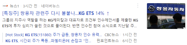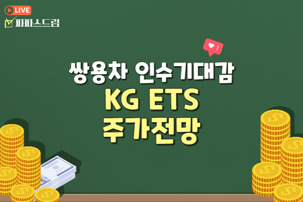 KG ETS에 신규진입을 원하시는 분은 동사의 주가가 눌림조정이 나오면 단기관점에서 접근가능할 것으로 예상되지만 쌍용차 인수관련주는 뉴스보도에 따라 변동성이 매우 클 수 있으니 유의하시는 것이 좋겠습니다.