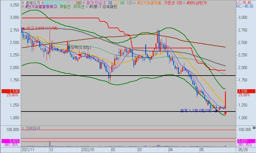 그럼에도 불구하고 썸에이지가 장 마감에 상한가로 마감한다면 위의 차트상 위의 선까지는 반등이 나올 가능성이 있습니다.