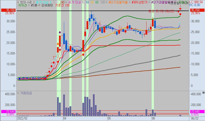 현대사료를 저점에서 매수하여 현재 수익중인 분은 최소 익절가를 설정하고 수익을 극대화하는 전략으로 접근하는 것이 좋겠습니다.