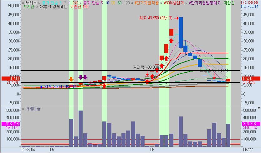 1:8 무상증자 이슈로 바닥구간에서 10배 가까이 상승한 노터스는 대규모 차익실현과 시장 하락이 맞물려 급락하였습니다.