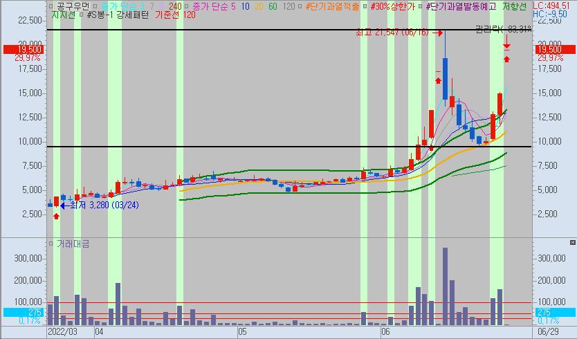오늘 점상한가에 진입하였는데 장 마감까지 상한가가 풀리지 않으면 내일 아침에도 갭을 크게 띄울 가능성이 높습니다.