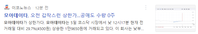 오늘은 주당 5주 무상증자를 결정했다는 소식으로 상한가에 진입한 모아데이타의 주가는 앞으로 어떻게 움직일 지 알아보도록 하겠습니다.