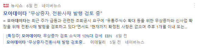 사실 모아데이타는 6일전 거래소의 현저한 시황변동 조회공시 요구에 무상증자 및 전환사채 발행을 검토중이라고 답변하였는데요.