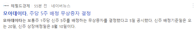 모아데이타는 오늘 구주 1주당 5주를 배정하는 1:5 무상증자를 결정했다는 소식으로 상한가에 진입하였습니다.