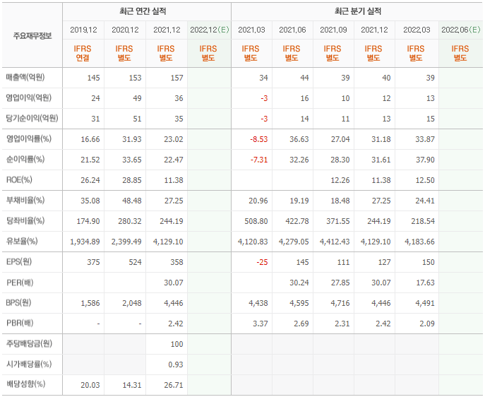 매출액과 영업이익이 크지는 않지만 매년 안정적으로 수익이 나오고 있으며 유보율이 4000%이상이기 때문에 유동성 위기를 겪을 일은 당분간 없어보이니 투자에 참고하시길 바랍니다.