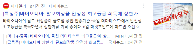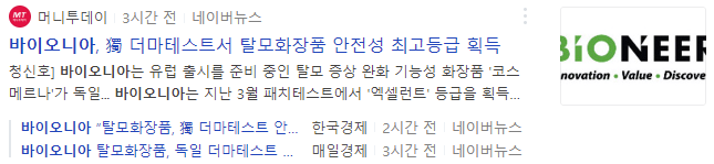 바이오니아는 자사의 탈모화장품이 독일에서 안정성 최고등급 인증을 받았다는 소식으로 장 초반부터 강하게 상승하여 상한가에 진입했습니다.