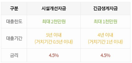 이 기간중 최대 1년간 거치기간을 부여할 수 있으며, 대출금리는 연 4.5%의 고정 단일 금리가 적용되니 참고하시길 바랍니다.
