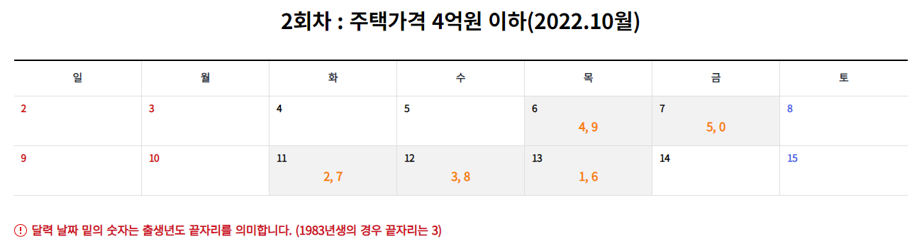 주택가격이 4억원 이하인 경우 10월 6일부터 신청이 가능하며 마찬가지로 출생년도 끝자리에 따라 신청일이 달라지니 참고하시길 바랍니다.