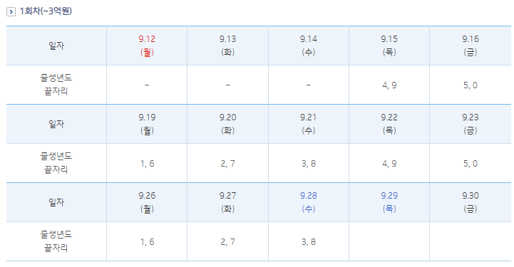 주택가격이 3억원 이하인경우 9월 15일부터 신청이 가능하며, 출생년도에 따라 신청 날짜가 달라지게 됩니다.