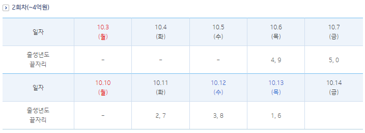 주택가격이 4억원 이하인 경우 10월 6일부터 신청이 가능하며, 마찬가지로 출생년도 끝자리에 따라 신청날짜가 달라지니 참고하시길 바랍니다.