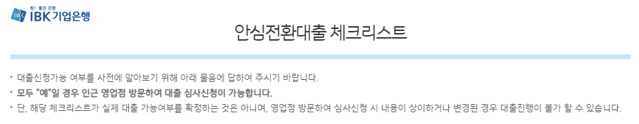기업은행 안심전환대출은 아래의 안심전환대출 체크리스트에 모두 예라는 답이 나올 경우 영업점에 방문하여 대출신청이 가능합니다.
