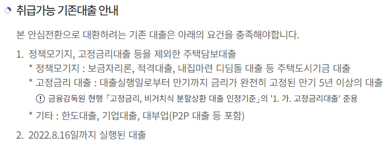 보유하고 있는 기존대출은 2022년 8월 16일까지 실행된 대출의 경우에만 인정되며, 8월 16일 이후에 실행된 대출은 변동금리 주택담보대출이라고 하더라도 안심전환대출을 신청할 수 없습니다.